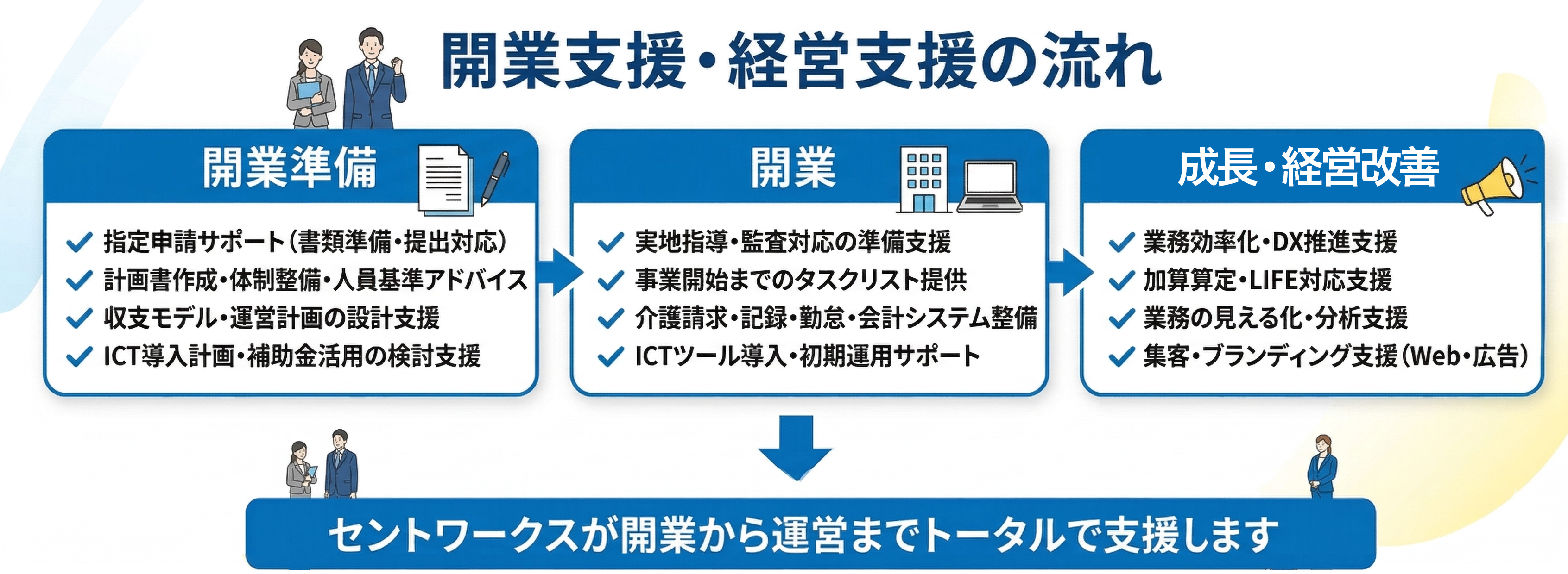 スムーズな事業スタートへ申請書類準備や人員基準、体制整備のアドバイスまで専門スタッフがサポート。