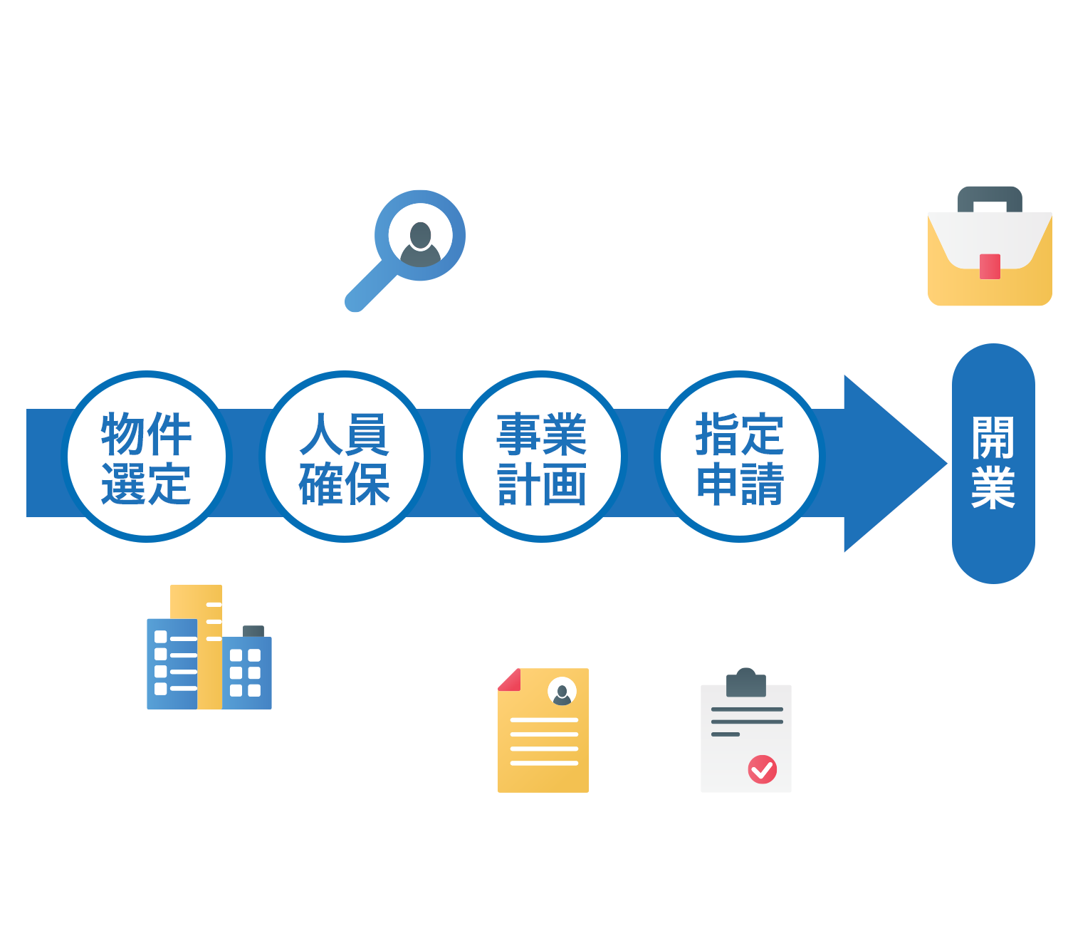 スムーズな事業スタートへ申請書類準備や人員基準、体制整備のアドバイスまで専門スタッフがサポート。
