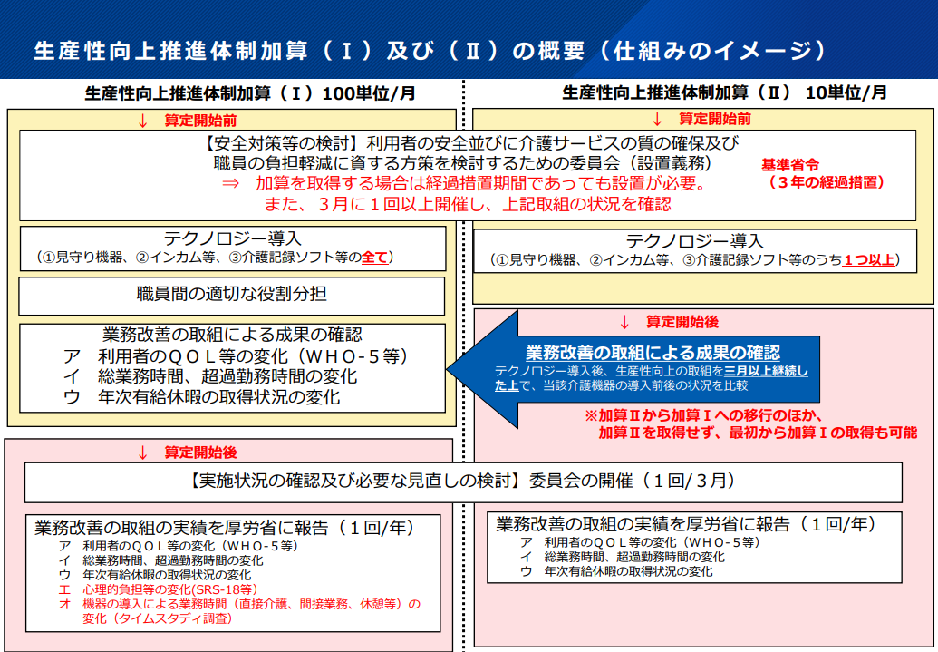 ICT機器の導入や業務改善活動を継続的に行い、その成果を年1回オンラインで提出することが要件となります。 - 加算(Ⅰ):月100単位