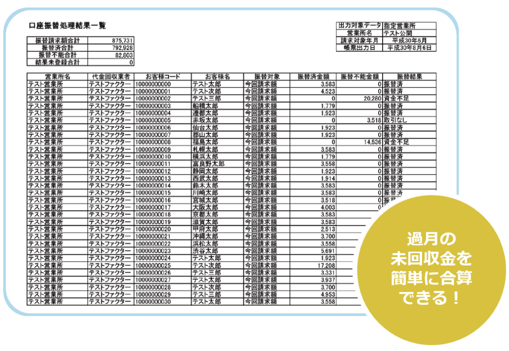 月々の売り掛け金管理をシステム内で運用する事で正確な口座振替請求データを作成する事が可能になります。これにより、手入力の請求データ作成による間違いを無くし事務作業時間も大幅に削減できます。